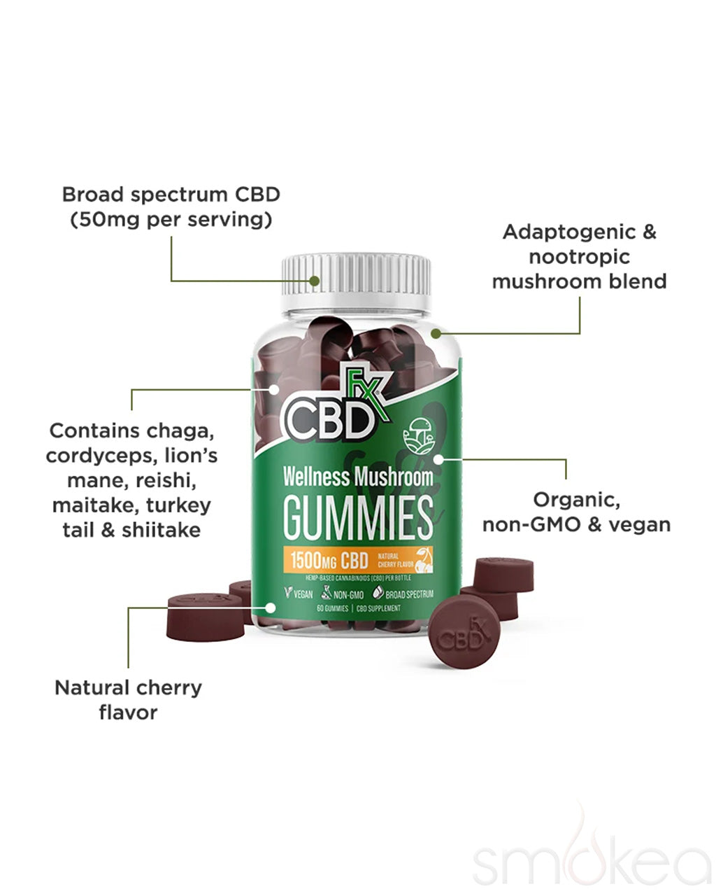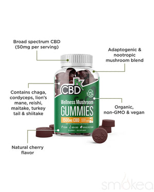 Support your daily balance and mental clarity with CBDfx Wellness CBD + Mushroom Gummies. These wellness-forward gummies blend 50mg of broad spectrum CBD with a potent 50mg dose of adaptogenic and nootropic mushrooms—including chaga, cordyceps, lion’s mane, turkey tail, reishi, shiitake, and maitake—creating a synergistic formula designed to help your body manage stress while enhancing focus and immune support.